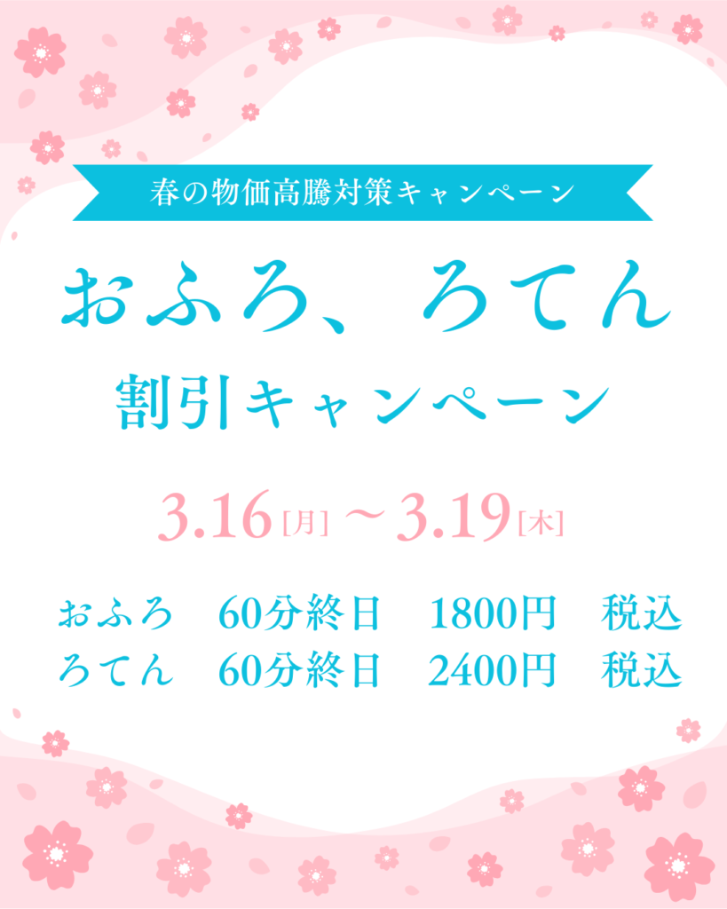3月16日から3月19日まで「おふろ、ろてん」のお部屋を割引します。