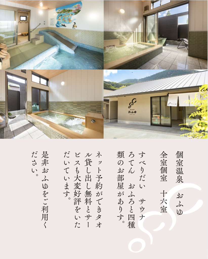 別府市堀田にある「個室温泉 おふゆ」は、365日24時間いつでもWEB予約・順番待ち予約が可能な別府の家族風呂(貸切風呂・家族湯)です。
