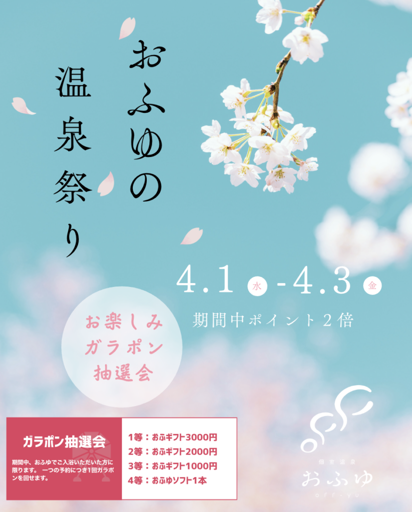 おふゆでも別府市の温泉まつりに合わせ、4月1日より3日間「おふゆ温泉祭り」を開催いたします。 期間中、ご入浴1回につき、豪華景品が当たる「ガラポン抽選会」にご参加いただけます。 ぜひお楽しみください。