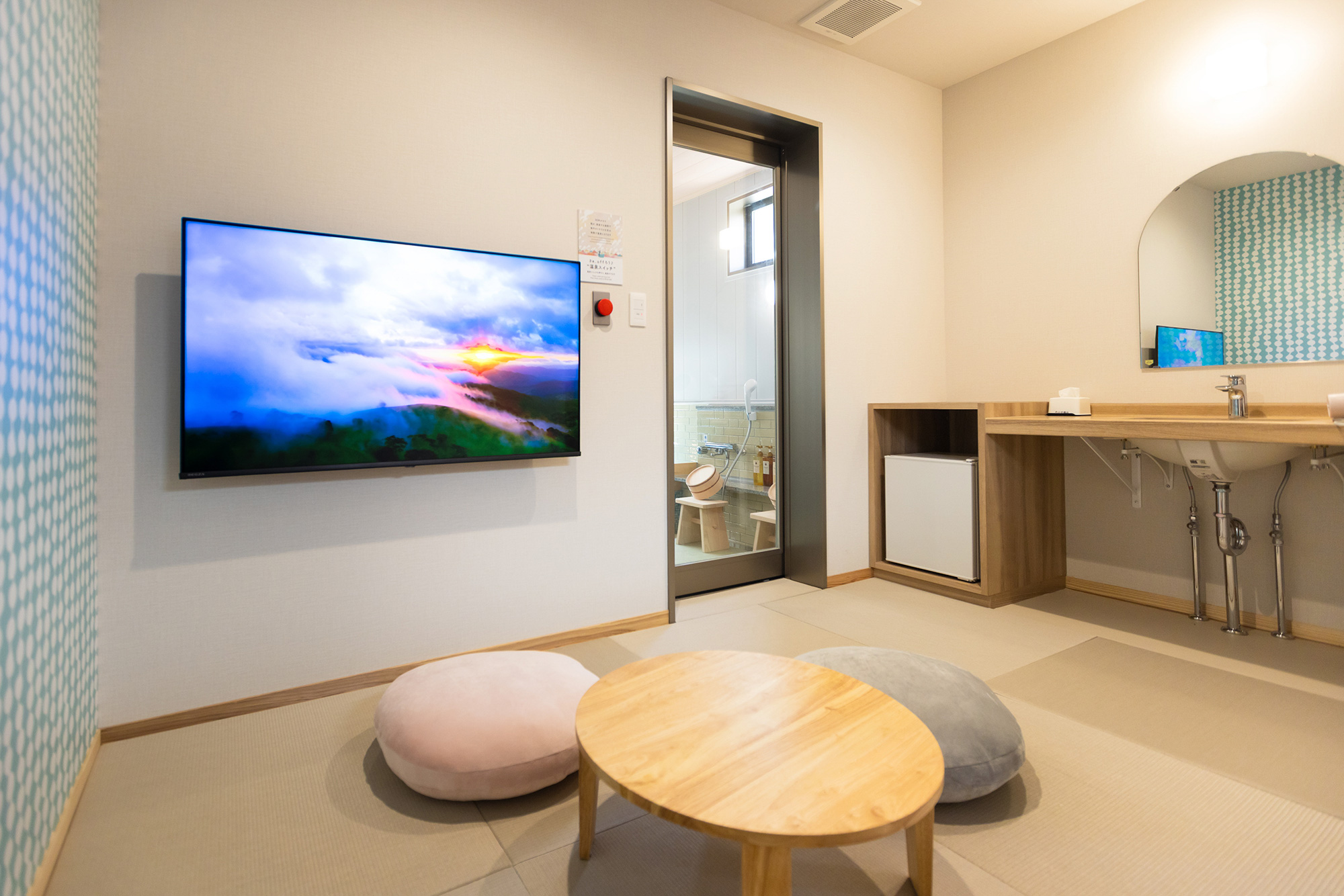 The bathroom walls of the three "Bath and Slide" rooms are decorated with Beppu Sento art, featuring seasonal Beppu scenery and cute animals enjoying Beppu.