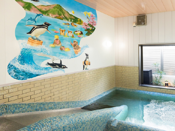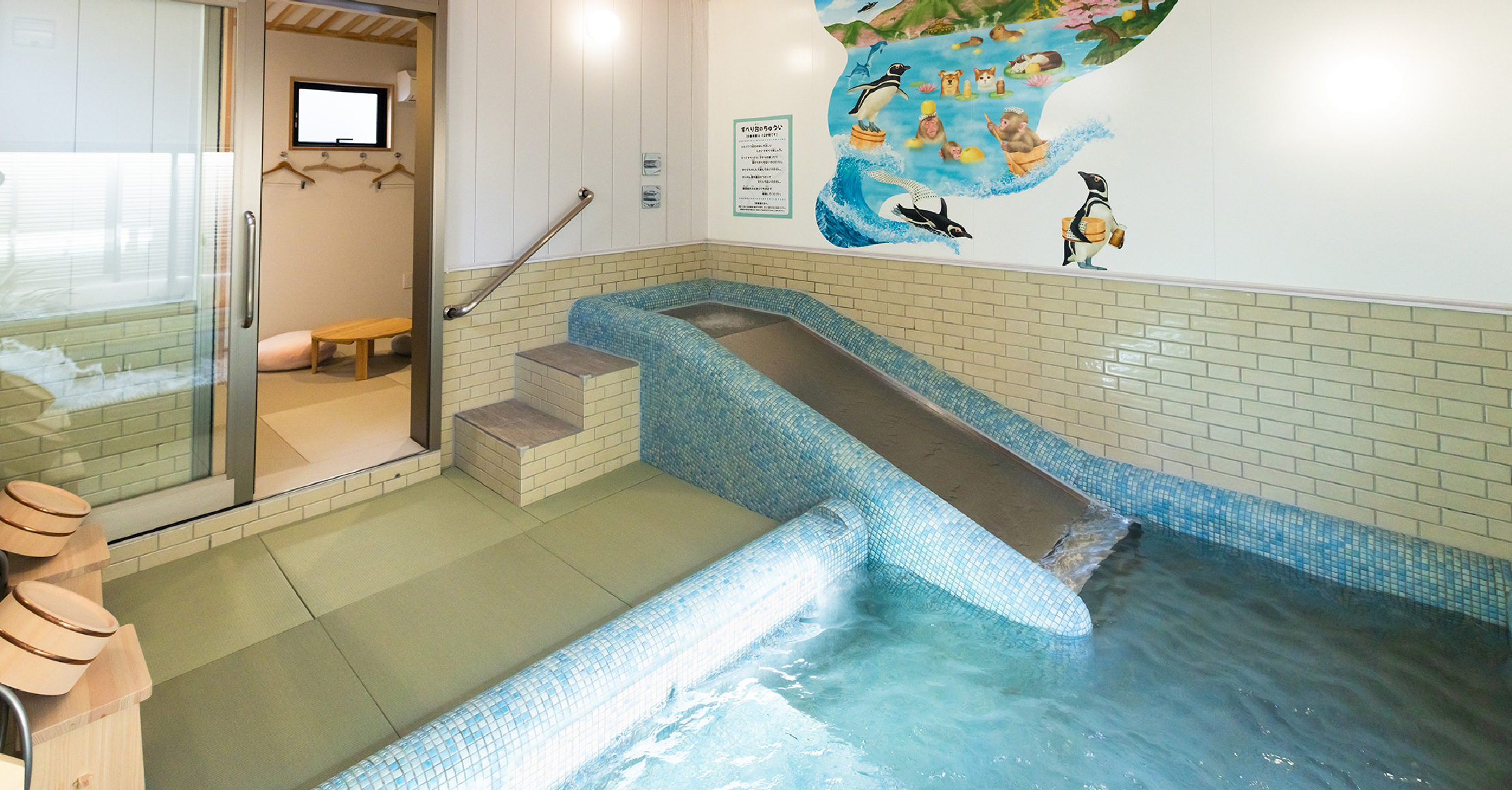 『오후로와 미끄럼틀』 3개의 방의 욕실 벽면에는, 계절마다의 벳푸의 풍경과, 귀여운 동물들이 벳푸를 즐긴다, 볶은 목욕탕 그림이 그려져 있습니다.